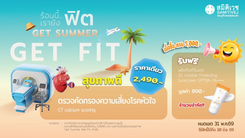 - สิทธิ์นี้ ไม่นับรวมยอดกับ แพ็กเกจตรวจสุขภาพ Get summer Get fit 1 แถม 1