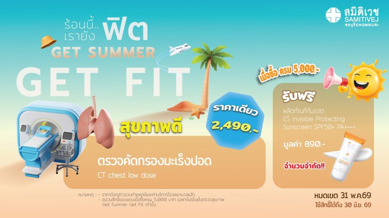 - สิทธิ์นี้ ไม่นับรวมยอดกับ แพ็กเกจตรวจสุขภาพ Get summer Get fit 1 แถม 1