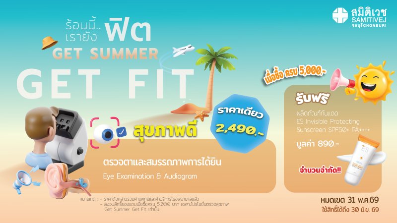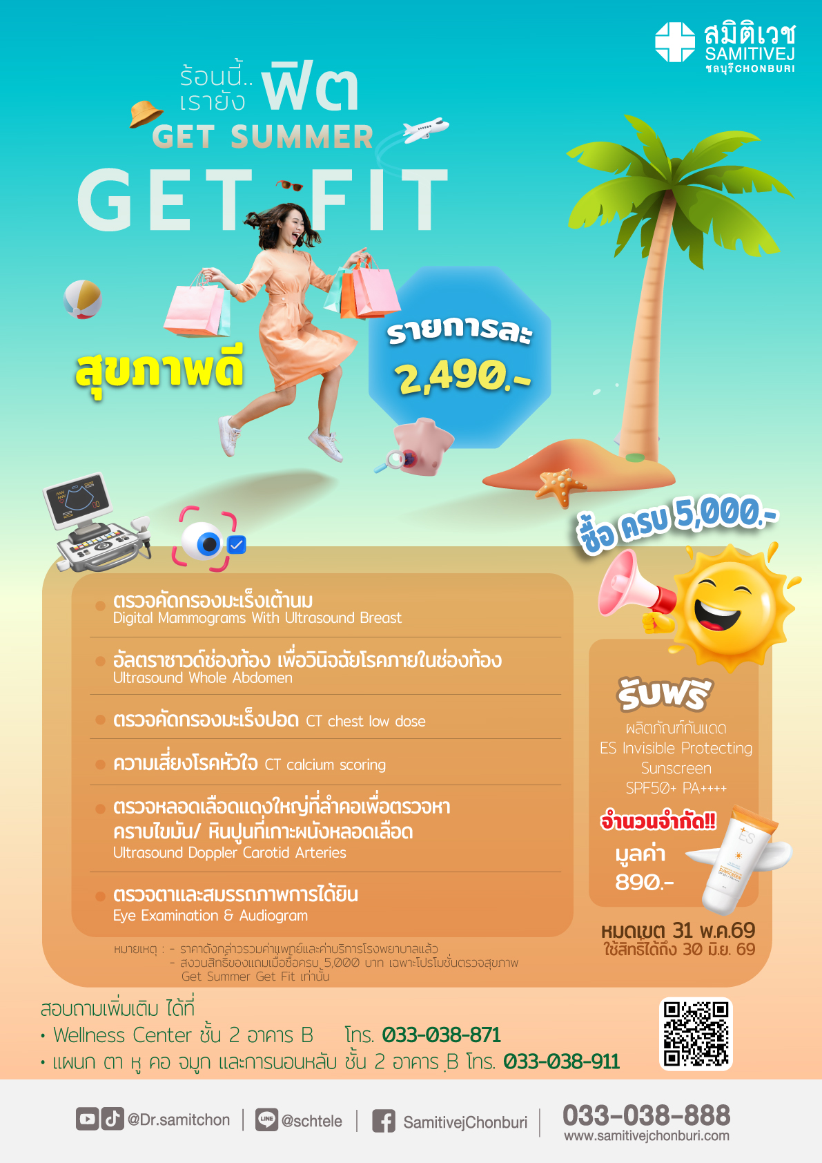 - สิทธิ์นี้ ไม่นับรวมยอดกับ แพ็กเกจตรวจสุขภาพ Get summer Get fit 1 แถม 1
